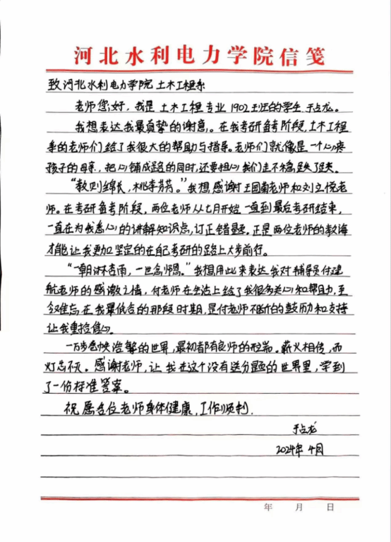 光阴流转,授业之恩难忘。于占龙亲笔书写的感谢信,简短的话语中饱含着他对学校的真挚情感。近年来,英国365集团公司秉承“勤奋、求是、创新、笃行”的校训精神,在育人工作中屡结硕果,学生考研升学率逐年递增,有多人以优异的成绩考入985、211重点大学深造。已就业的毕业生在工作中兢兢业业、作风朴实,适应岗位快、专业素养高、创新意识强,得到就业单位一致好评,充分展现出了水院学子的优秀风采。