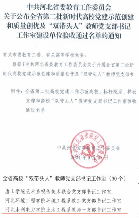 9月27日传来喜讯,根据《中共河北省委教育工作委员会关于公布全省第二批新时代高校党建示范创建和质量创优及“双带头人”教师党支部书记工作室建设单位验收通过名单的通知》,英国365集团公司教师一支部顺利通过了河北省第二批高校“双带头人”教师党支部书记工作室建设验收,这一成果标志着学校在基层党组织建设方面取得了又一重要进展。