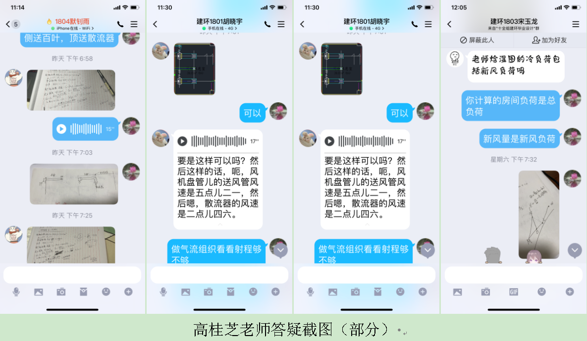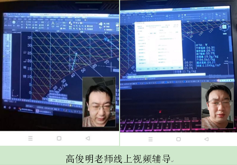 建环教研室承担建环18级的毕业设计指导任务,共计95人。疫情期间,师生不能面对面地进行交流和指导,这给毕设指导带来了诸多困难。各位指导老师积极应对,采取多种方式,确保学生的毕业设计按时按计划地顺利进行。高俊明老师采用腾讯视频的方式,一对一地给学生讲解焓湿图的绘制;李浩老师采用腾讯会议的方式,给学生进行心理疏导和布置任务;李树谦老师在线视频指导学生进行仿真实验;高桂芝老师则是不分昼夜地在QQ和微信上对学生的提问进行回答。高桂芝老师说:“隔离在家就一件事,那就是不停的回复学生的问题。我打字慢,就发语音,每天喊的嗓子疼!”除了每周定时地开展集中辅导,每位指导老师都在线上对学生的提问及时回复,不分时段。