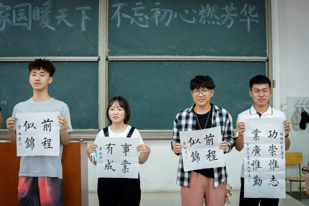 李浩老师指出同学们四年间有了很大的进步,希望毕业后能够再接再厉,再创辉煌,并送上了亲自题写的书法作品,预祝各位同学事业有成,前程似锦!