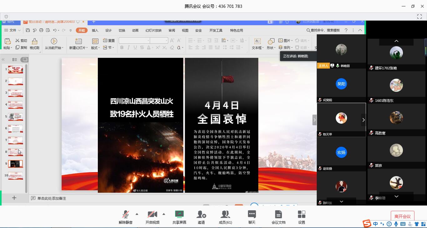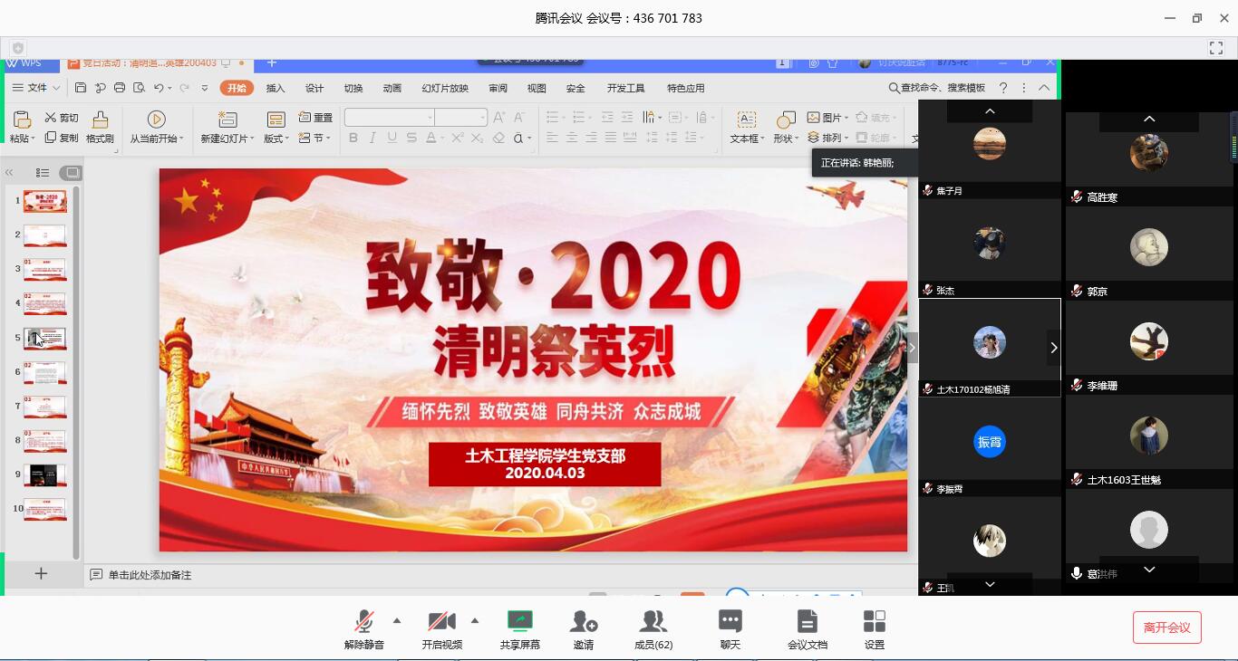 为弘扬爱国主义精神,缅怀革命先烈,致敬为抗击新冠肺炎疫情牺牲的烈士们,进一步引导党员同志领会英雄先烈的崇高爱国精神,增强党员同志们的责任感和使命感。4月3日我院学生党支部开展“致敬先烈,缅怀英雄”线上主题党日活动。此次活动通过腾讯会议进行,支部全体党员参加了会议,会议由韩艳丽老师主持。