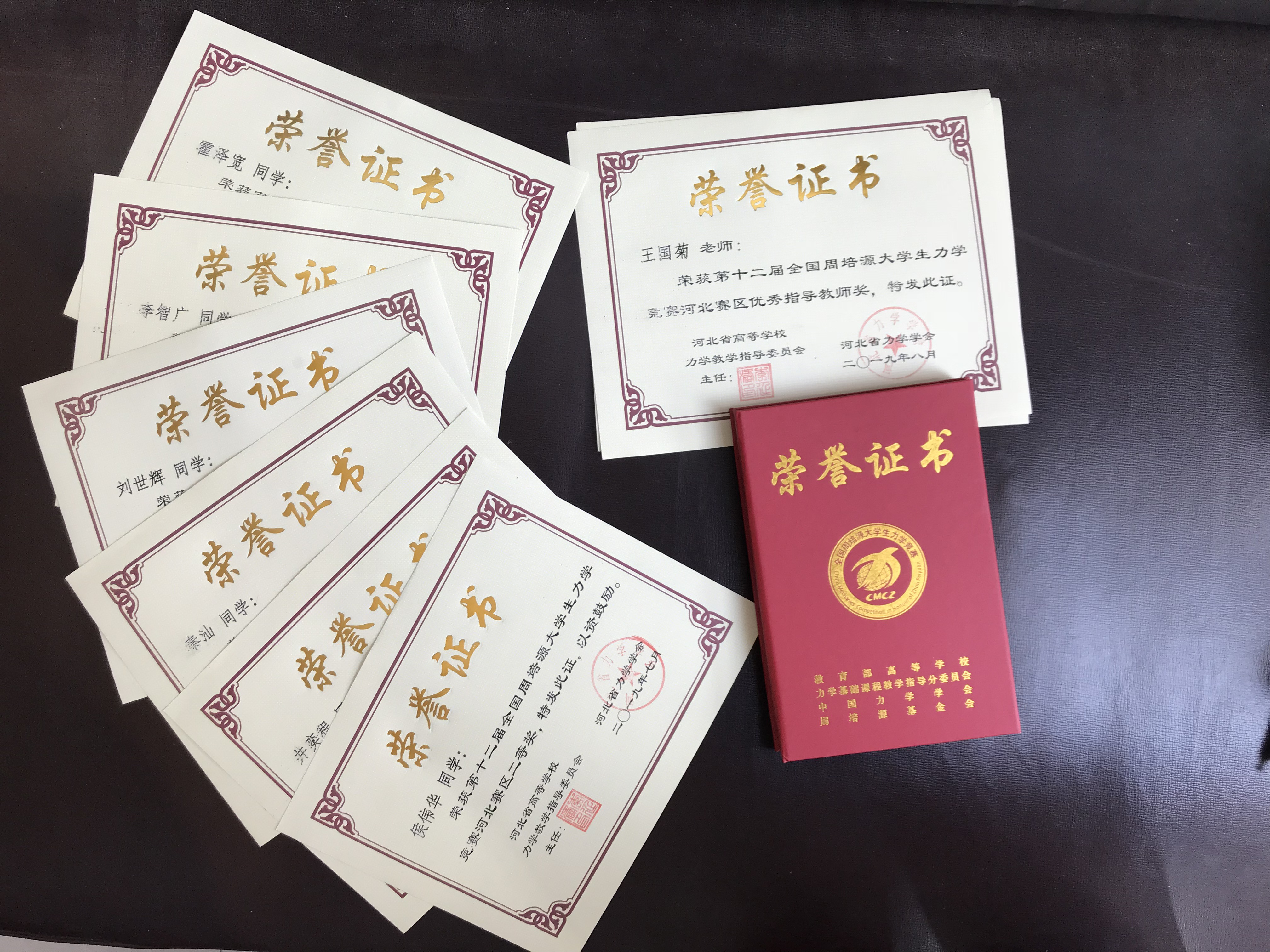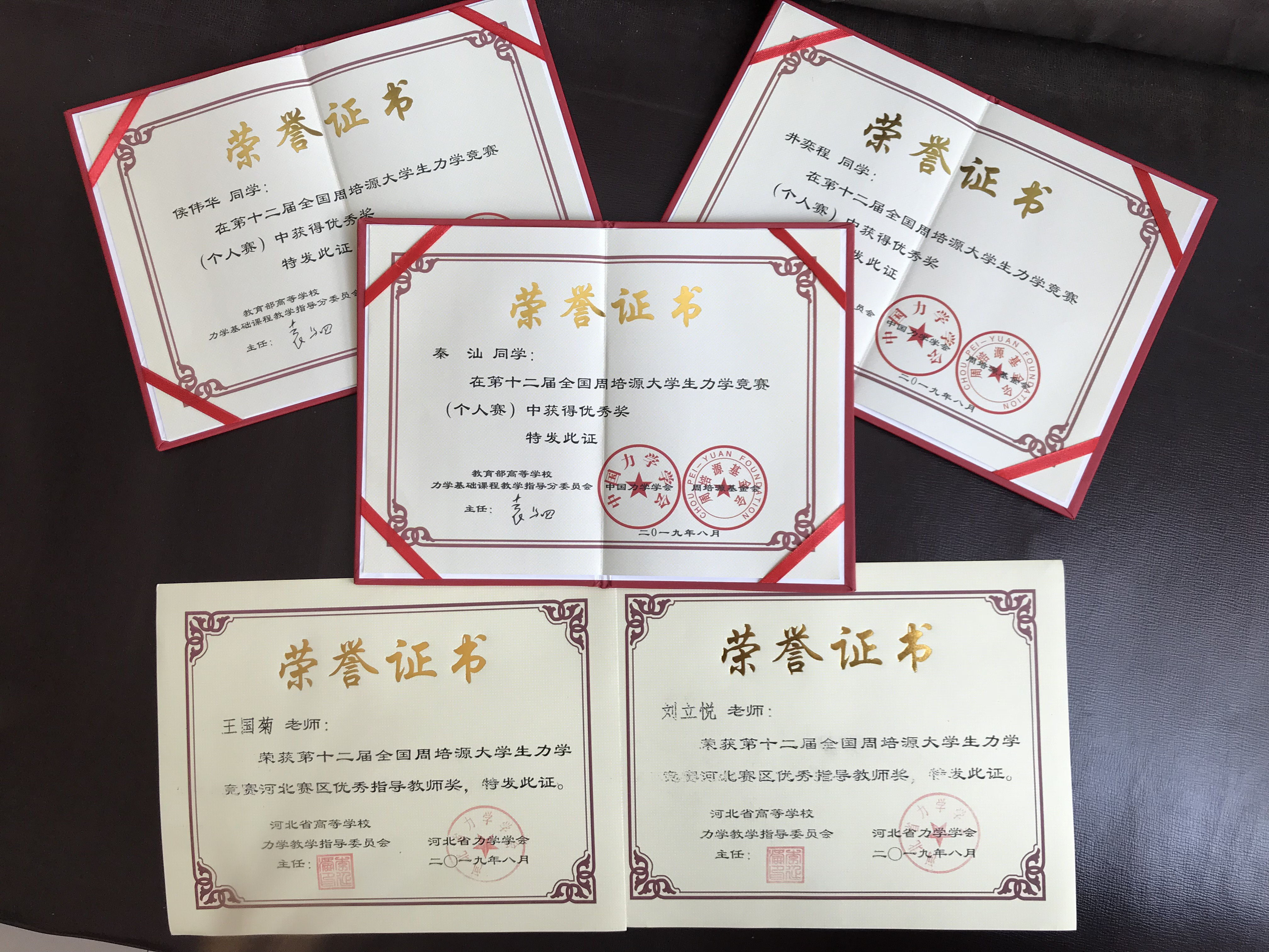 我校学生在2019年第十二届全国周培源大学生力学竞赛(个人赛)中喜获佳绩。其中全国优秀奖4名,河北赛区二等奖3名,河北赛区三等奖3名的好成绩,刘立悦、王国菊两位老师获得河北赛区优秀指导教师奖。