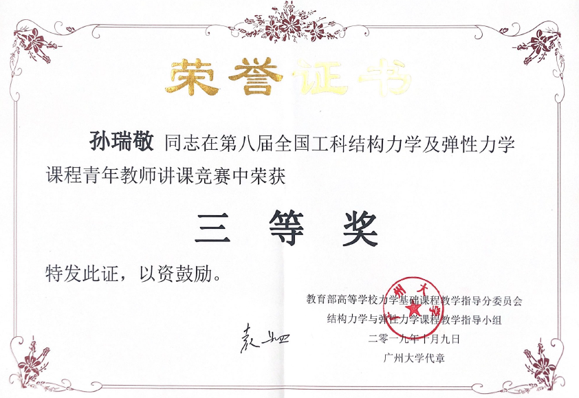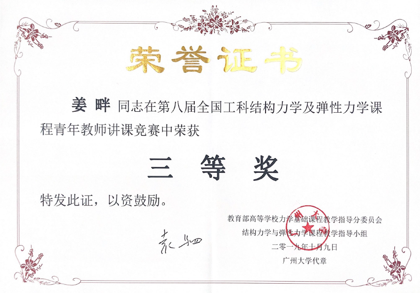2019年10月6日至9日,由教育部高等学校力学基础课程教学指导分委员会主办的第八届全国结构力学及弹性力学青年教师讲课竞赛在广州大学成功举行。本次比赛有来自哈尔滨工业大学、西北农林科技大学、中国矿业大学等全国多所高等院校的50多名青年教师参加,我校土木工程学院力学教研室选派4名青年教师参赛。最终,我校孙瑞静、姜畔两位教师凭借所讲的《结构力学》课程,分别获得三等奖。