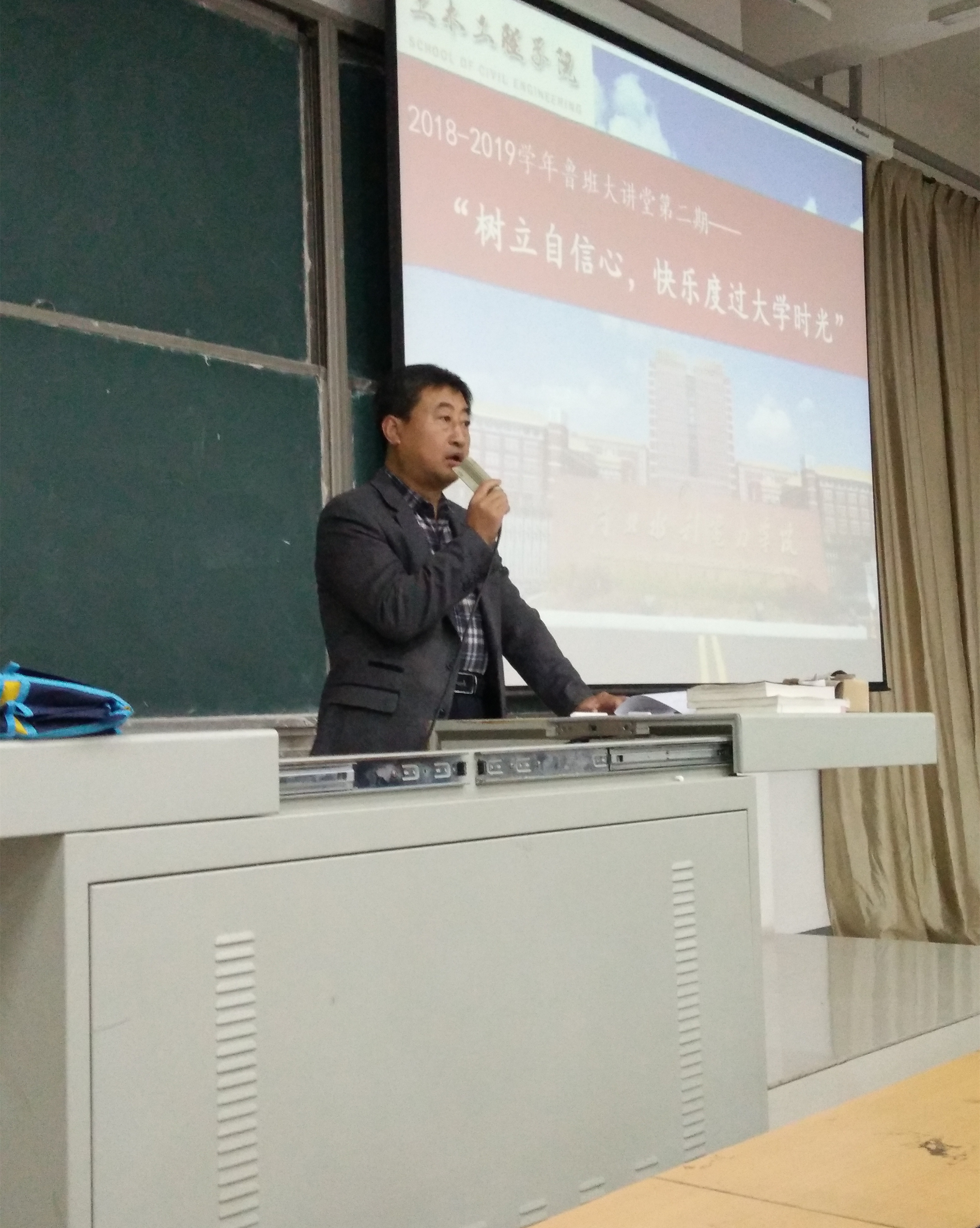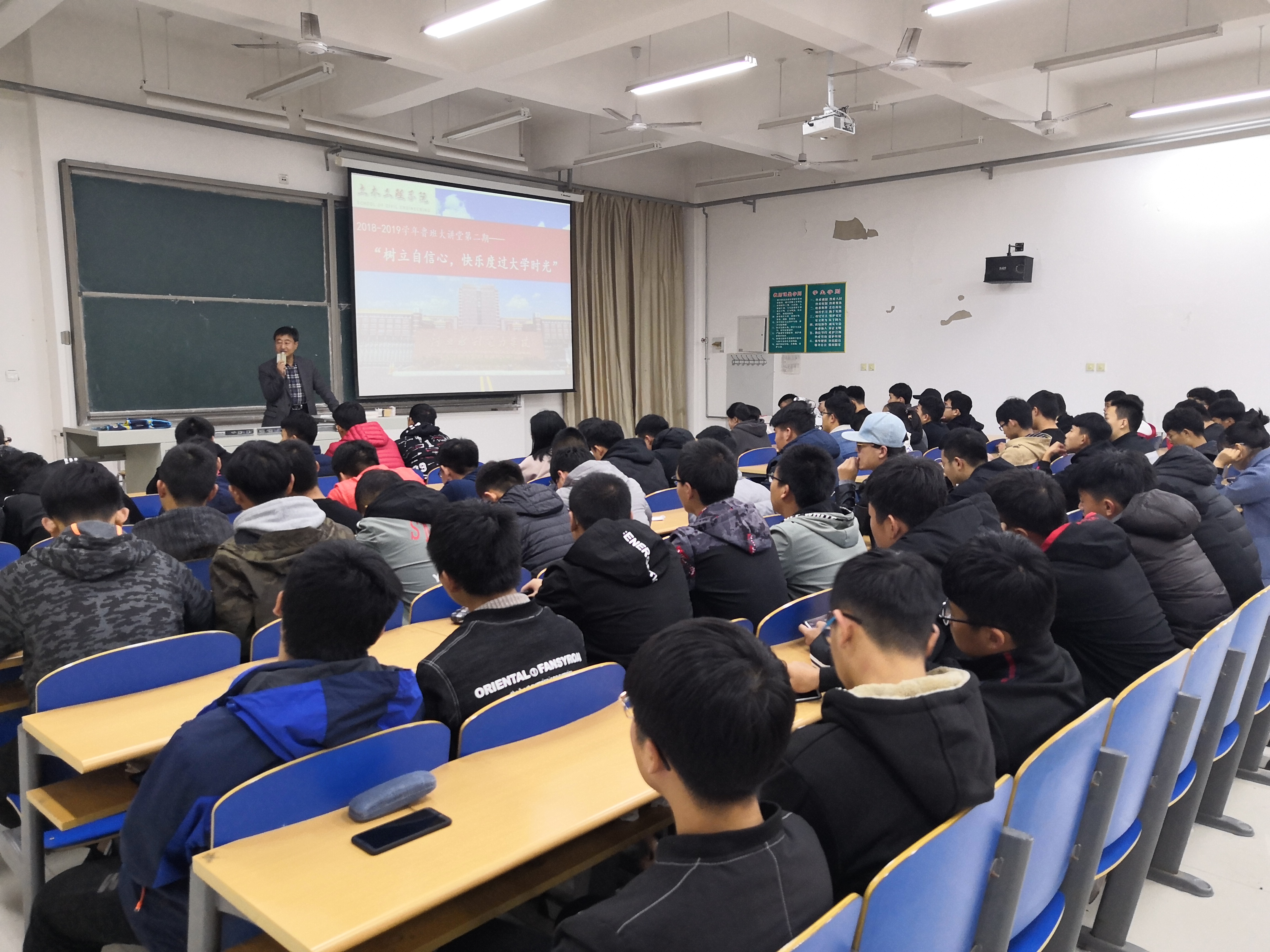 11月15日下午,土木工程学院党总支书记葛洪伟老师给对大学生活难免期待且迷茫的大一新生们于4C301做了一堂主题为“树立自信心,快乐度过大学时光”的讲座。大学生活对于我们每个人都是新鲜的,都是未知的。如何前行,如何思考,如何体会,如何感悟,不仅需要我们每个人亲身经历,更需要引领的灯塔照亮我们前行的黑夜。葛书记针对同学们刚步入大学生活可能遇到的问题给予了自己的建议。