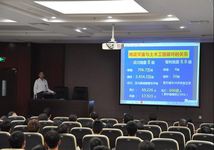 报告中,李教授从国内外百年地震灾害宝贵教训、重大工程典型震害、工程震害研究意义和方法、国内外地震台试验现状及发展等几个方面进行了深入阐述。他指出地震之所以造成灾害,特别是地震导致的人员伤亡和财产损失,主要因为土木工程不能抵御地震的作用而导致失效和破坏!地震灾害的实质是土木工程灾害,土木工程方法和措施是人类应对地震灾害的最有效的武器!并为学生们指出了今后土木工程灾害防御的关键问题:灾害性荷载的破坏作用及强度和频度的评估;灾害性荷载的区划特征和分布的研究;土木工程在灾害性荷载作用下的响应特征及其破坏机理的研究;土木工程在灾害性荷载作用下的工程抗灾理论与措施的研究;土木工程抗灾设计规范研究。李教授的报告生动具体、图文并茂,使广大师生对地震灾害有了更加深入的了解。