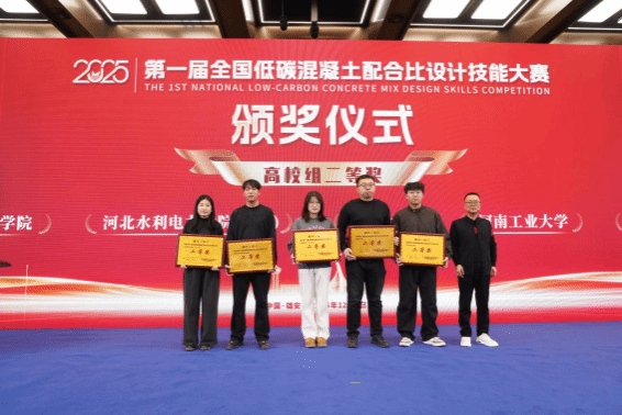会议期间,团队积极参与多项专题研讨、技术交流与标准工作会议,围绕固废基胶凝材料产业化、低碳混凝土制备技术、建材碳核算与标准体系等前沿议题,与来自全国各地的专家学者、企业代表进行了深入交流。尤为值得祝贺的是,吴金花博士在此次大会上被授予河北省硅酸盐学会低碳胶凝材料专业委员会专家委员以及全国低碳胶凝材料与低碳混凝土技术联盟专家委员会委员双重学术职务。这不仅是对教师个人学术能力的充分肯定,也是对我校在该研究方向团队整体实力的认可。此外,在本次大会的颁奖环节,还揭晓了今年8月举办的全国低碳混凝土配合比设计大赛的评选结果。我校派出的两支参赛队伍表现出色,分别荣获二等奖和三等奖各一项,展现了扎实的专业功底与创新能力。同时,凌飞飞、刘振平、许晓文三位老师荣获优秀指导教师称号,体现了他们在学生培养和实践指导方面的突出贡献。