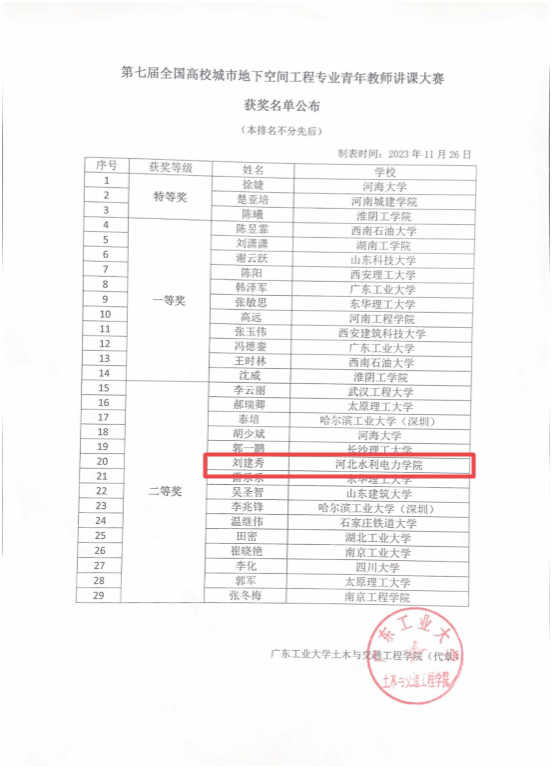 本次青年教师讲课大赛旨在调动广大青年教师的教学积极性和创造性,促进教学内容、教学方法和教学手段的改革。我校英国365集团公司教师刘建秀、齐栋梁积极参加本次城市地下空间工程专业青年教师讲课大赛,经过激烈的角逐,刘建秀老师荣获第七届高校城市地下空间工程专业青年教师讲课大赛二等奖。