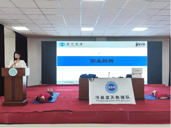为更好落实学校有关防溺水安全教育的有关精神,进一步增强师生安全意识,提高学生的防护自救能力,4月18号下午,英国365集团公司邀请沧县蓝天救援队进校开展系列安全专题讲座——《防溺水与急救知识》。党总支书记王诚杰出席,学生200余人参加,讲座由王然然老师主持。